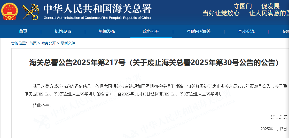 11月7日,海关总署发布公告:根据美国整改措施审查结果,根据我国相关法律法规,决定取消海关总署资质编号。自2025年11月10日起,恢复CHS Inc.等3家企业对美国大豆出口资质。南方网广东考察记者叶丽子