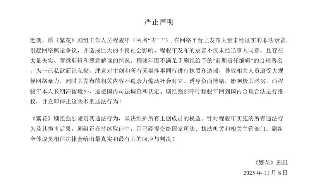 11月8日,热播电视剧《繁花》剧组发布声明,回应网络平台发布前工作人员程君年(网名“谷儿”)录音引发的舆论争议。声明指出,其行为涉嫌散布谣言、抹黑、煽动对抗,剧组已开始收集证据并提交司法机关。声明中,剧组直接指出了程君年的行为动机——因对剧组给出的“初步责任编辑”的合理签名不满意,为一己私欲发泄私愤,想要对主创及所有涉案无辜同事进行抹黑、造谣,引发相关人员大规模网络暴力。同时,他发布的相关内容并没有试图挑起社会对抗、煽动负面情绪,这产生了负面影响。程俊年目前长期滞留在国外,躲避国内司法调查和判定。对此,剧组强烈呼吁他尽快返回中国,通过合理合法途径维护自己的权利,立即停止一切违法行为。针对程俊年的一系列行为,《布拉克拉克》工作人员表示,一定会维护所有主创成员的合法权益。目前,剧组正在继续收集关于程俊年的违法行为以及品萨拉的相关后果的证据,所有证据均已提交给国家司法执法机构和相关主管部门。据悉,电视剧《繁花》改编自作家金宇成的同名小说,由王家卫导演领衔主演,云集了胡歌、马伊琍、唐嫣等众多实力派演员。然而,最近,大量网络上突然出现了有关工作人员的争议言论,来源直接指向前工作人员程俊年发布的多条录音。此前有报道称,编剧“谷二”发表长文称自己深度参与《花》的编剧,但最终没有版权,也没有报酬。在加入剧组的过程中,他也承担了王家卫生活中的一些卧铺工作,但工资只有几千元。 10月31日,“咕儿”在社交平台上传了《花儿》的“剧本见面会录音”。由于其中含有王家卫与编剧秦文(《繁花》、《我的前半生》、《大嫂》、《流金岁月》的签约编剧)私下讨论演员的内容,引发网络热议。南方网广东考察记者倪世轩