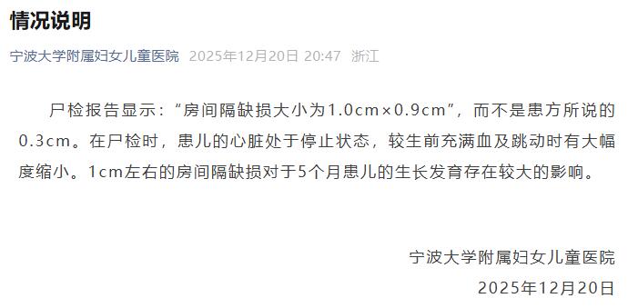 12月20日20时47分,“宁波大学附属妇女儿童医院”公众微信发布声明:尸检报告显示:“房间隔缺损尺寸为1.0厘米×0.9厘米”,并非患者所说的0.3厘米。尸检时,孩子的心脏已经停止跳动,而且比死前充满血液、搏动时的心脏要小。 1cm左右的房间隔缺损对5个月大的孩子的生长发育影响很大。此后不久,医院删除了上述声明。